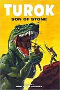 In this volume Native Americans Turok and Andar continue to search for a way out of the lost valley they've been trapped in. In the first story a falling star causes a fire, which stampedes some dinosaurs. The crash draws the attention of various tribes, from underground albino "Spider men" to tree living "monkey men" to giants. They all want possession of the crater and fight for it. Of course, this blocks the path of Turok's journey and they're captured to be sacrificed to the "sky god" and promptly escape. The earthquakes that result from crash opens up a fissure in the cliff walls, leading to the outside world-they see it but can't make it out in time before it closes again. Turok thinks it's a good thing because he says they couldn't have let the dinosaurs out into their world.